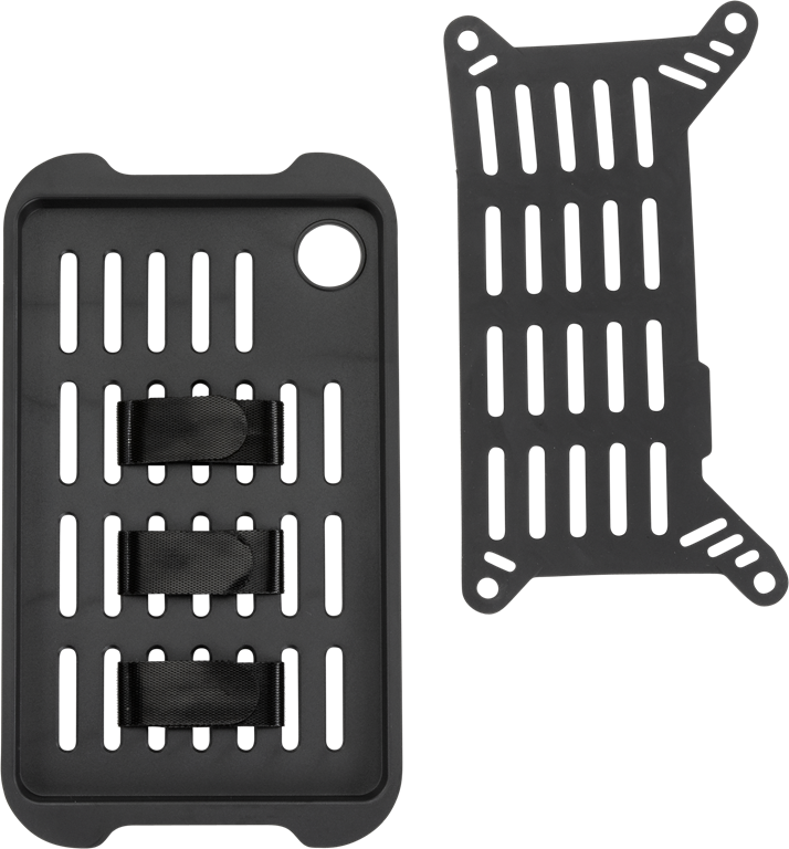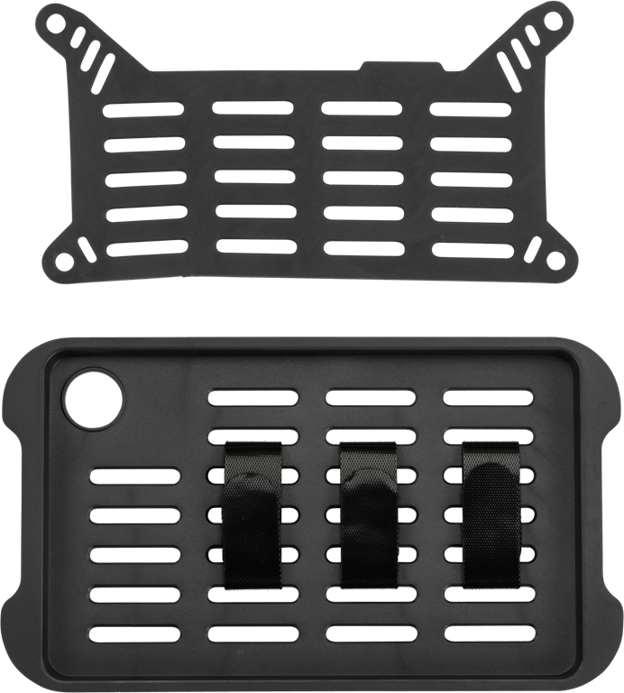 - Sistema de asas estilo MOLLE* con correas de nailon para asegurar los objetos a la tapa y la bandeja